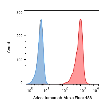 • Flow cytometric analysis of 1.5×106 HT-29 cells labeling Adecatumumab (HY-P99278, red). Cells were fixed with 4% paraformaldehyde. Then stained with the primary antibody at 1/200 dilution for an hour at 4℃. Alexa Goat Anti-Human IgG H&L (AF488) (HY-P83776) was used as the secondary antibody at 1/1,000 dilution for 30 minutes at 4℃. Human IgG1 kappa Isotype Control (HY-P99001, blue) was used as the isotype control, cells without incubation with primary antibody were used as the unlabeled control (black).