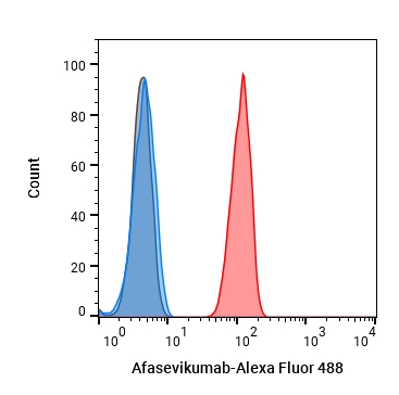 • Flow cytometric analysis of 1X106 Jurkat cells with Afasevikumab (HY-P99424, red). Cells were fixed with 4% paraformaldehyde and permeabilised with 90% methanol. Then stained with the primary antibody at 1/200 dilution for an hour at 4℃. Alexa Fluor 488-conjugated AffiniPure Goat Anti-Human IgG H&L (HY-P83776) was used as the secondary antibody at 1/1,000 dilution for 30 minutes at 4℃. Human IgG1 kappa Isotype Control (HY-P99001, blue) was used as the isotype control, cells without incubation with primary antibody were used as the unlabeled control (black).