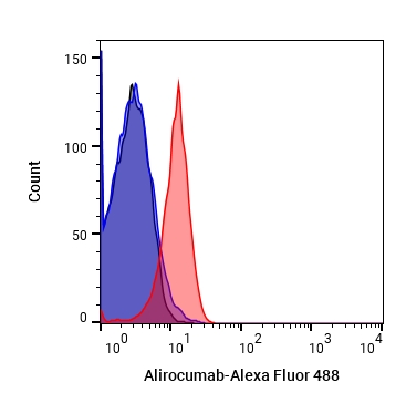 • Flow Cytometry analysis of Hela cells labelling PCSK9 (red) with Alirocumab (anti-PCSK9) (HY-P9928). Goat Anti-Human IgG (Alexa Fluor 488) (HY-P83776) at a dilution of 1/1000 was used as the secondary antibody. Blue-Human IgG1 kappa (HY-P99001). Black-Unlabelled control, cells without incubation with primary antibody.