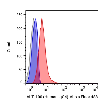• Flow cytometric analysis of 1X106 MCF-7 cells with ALT-100 (Human IgG4) (HY-P990319, red). Cells were fixed with 4% paraformaldehyde. Then stained with the primary antibody at 1/200 dilution for an hour at 4℃. Alexa Fluor 488-conjugated AffiniPure Goat Anti-Human IgG H&L (AF488) (HY-P83776) was used as the secondary antibody at 1/1,000 dilution for 30 minutes at 4℃. Human IgG4 kappa (HY-P99003, blue) was used as the isotype control, cells without incubation with primary antibody were used as the unlabeled control (black).