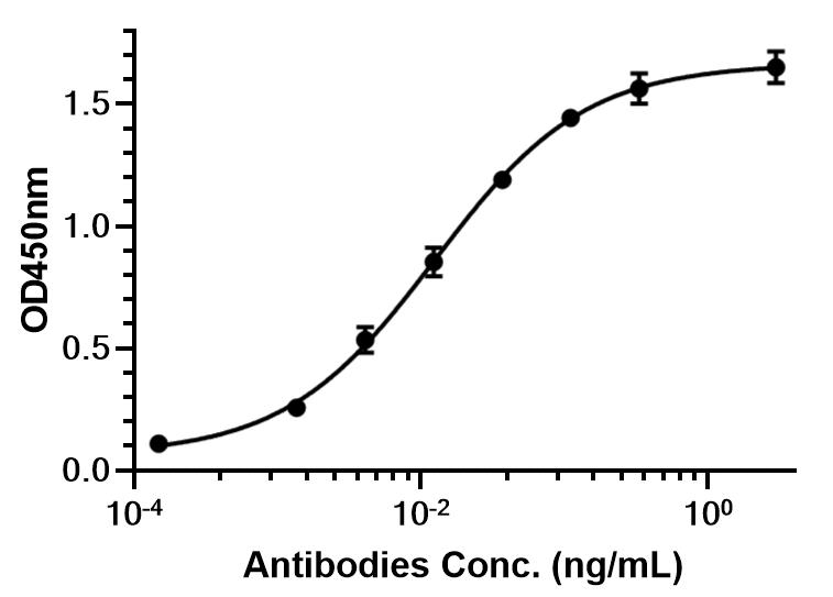 • Immobilized hAng2-his can bind Anti-ANGPT2 Antibody. The EC50 for this effect is 12.61 ng/mL.