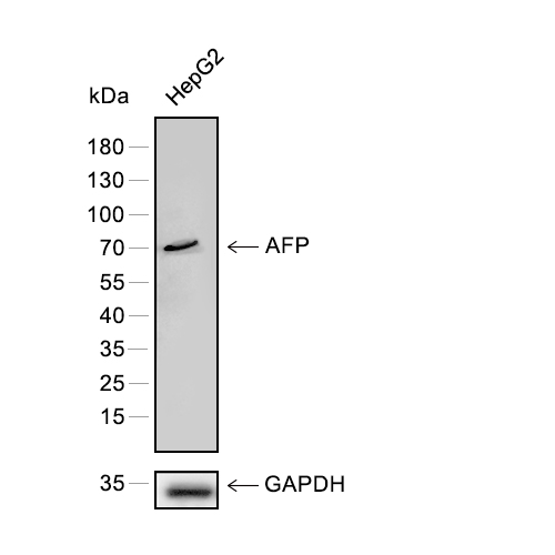 • Western blot analysis of extracts from HepG2 (lane 1) using AFP antibody. Proteins were transferred to a PVDF membrane and blocked with 5% nonfat powdered milk in PBST for 2 hour at room temperature. The primary antibody (1/2000) and Loading control antibody (GAPDH, 1/3000) was diluted with 5% nonfat powdered milk in PBST at 4°C overnight. Goat Anti-mouse IgG-HRP Secondary Antibody (1/8,000) was incubated for 45min at room temperature.