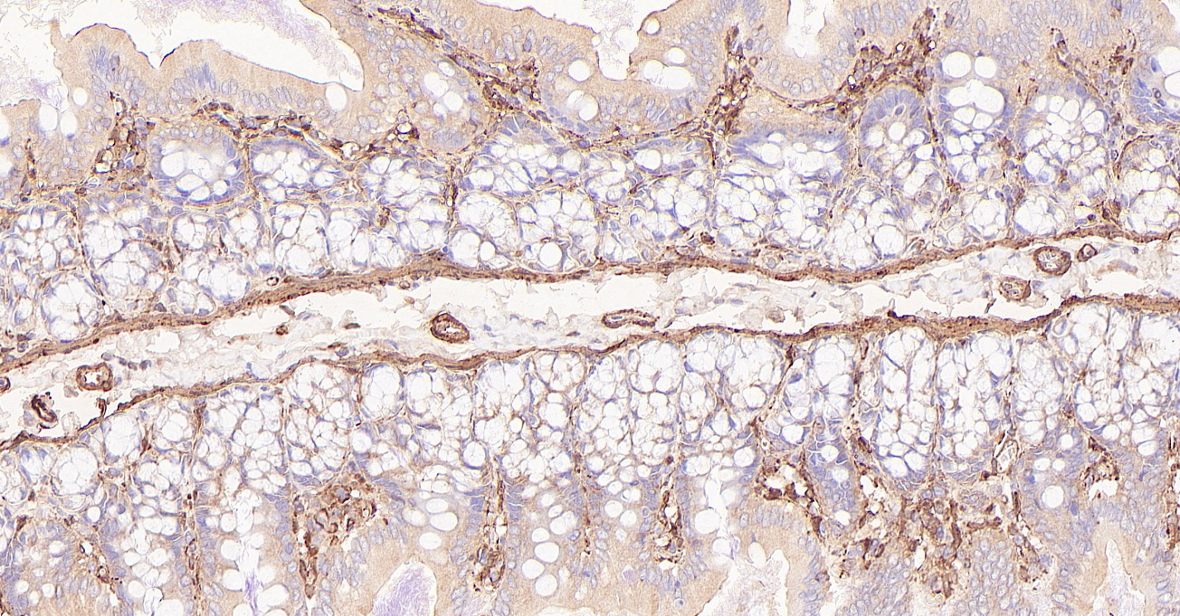 • Immunohistochemical analysis of paraffin-embedded Rat colon tissue using alpha smooth muscle Actin Antibody. The section was pre-treated using heat mediated antigen retrieval with Tris-EDTA buffer (pH 8.0) for 8 minutes. The tissues were blocked in QuickBlock for 20 minutes at room temperature, washed with ddH2O and PBS, and then probed with the primary antibody (HY-P80484, 1/200) in 4℃ overnight. The detection was performed using an HRP conjugated compact polymer system. DAB was used as the chromogen. Tissues were counterstained with hematoxylin and mounted with DPX.