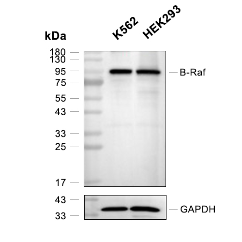 • Western blot analysis of extracts from K562(lane 2(20μg) and HEK293(lane 3(20μg) ) using B-Raf (HY-P80036) Mouse mAb. Proteins were transferred to a PVDF membrane and blocked with 5% BSA in TBST for 2 hour at room temperature. The primary antibody (HY-P80036, 1/1000) and Loading control antibody (GAPDH, HY-P80954, 1/3000) was used in 5% BSA in TBST at 4°C overnight. Goat Anti-Mouse IgG-HRP Secondary Antibody (HY-P8004, 1/10,000) was used for 1 hour at room temperature.