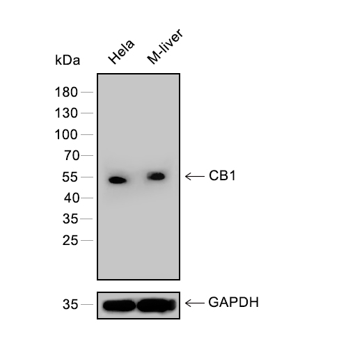 • Western blot analysis of extracts from Hela (lane 1) and M-liver (lane 2) using CB1 antibody. Proteins were transferred to a PVDF membrane and blocked with 5% nonfat powdered milk in PBST for 2 hour at room temperature. The primary antibody (1/1000) and loading control antibody (GAPDH, 1/3000) was diluted with 5% nonfat powdered milk in PBST at 4°C overnight. Goat Anti-Rabbit IgG-HRP Secondary Antibody (1/8,000) was incubated for 45min at room temperature.