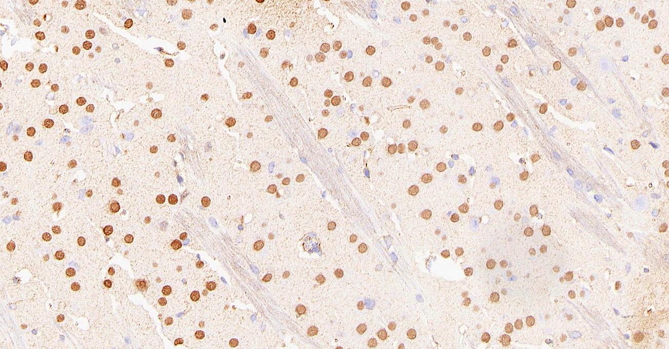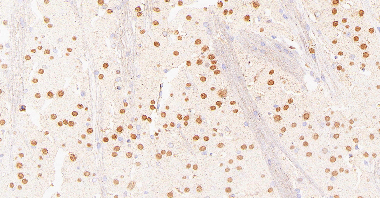 • Immunohistochemical analysis of paraffin-embedded Rat brain tissue using Ctip2 Antibody. The section was pre-treated using heat mediated antigen retrieval with sodium citrate buffer (pH 6.0) for 8 minutes. The tissues were blocked in QuickBlock for 20 minutes at room temperature, washed with ddH2O and PBS, and then probed with the primary antibody (HY-P80095, 1/500) in 4℃ overnight. The detection was performed using an HRP conjugated compact polymer system. DAB was used as the chromogen. Tissues were counterstained with hematoxylin and mounted with DPX.