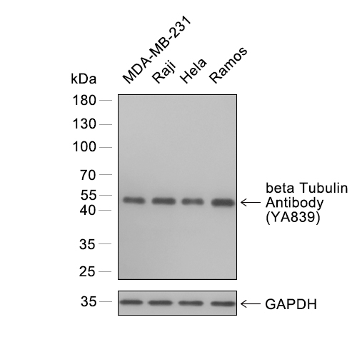 • Western blot analysis of extracts from MDA-MB-231 (lane 1) and Raji (lane 2) and Hela (lane 3) and Ramos (lane 4) using beta Tubulin antibody. Proteins were transferred to a PVDF membrane and blocked with 5% nonfat powdered milk in PBST for 2 hour at room temperature. The primary antibody (1/3000) and Loading control antibody (GAPDH, HY-P80954A, 1/3000) was diluted with 5% nonfat powdered milk in PBST at 4°C overnight. Goat Anti-Rabbit IgG-HRP Secondary Antibody (1/8,000) was incubated for 45min at room temperature.