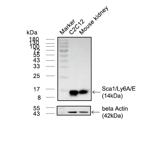 • Western blot analysis of extracts from C2C12 (lane 2(20μg)) and Mouse kidney (lane 3(20μg)) using Ly6A/E Rabbit mAb. Proteins were transferred to a PVDF membrane and blocked with 5% non-fat milk in TBST for 2 hour at room temperature. The primary antibody (1/1000) and Loading control antibody (beta Actin, HY-P83730, 1/5000) was used in 5% non-fat milk in TBST at 4°C overnight. Goat Anti-Rabbit/Mouse IgG-HRP Secondary Antibody (1/10000) was used for 1 hour at room temperature.