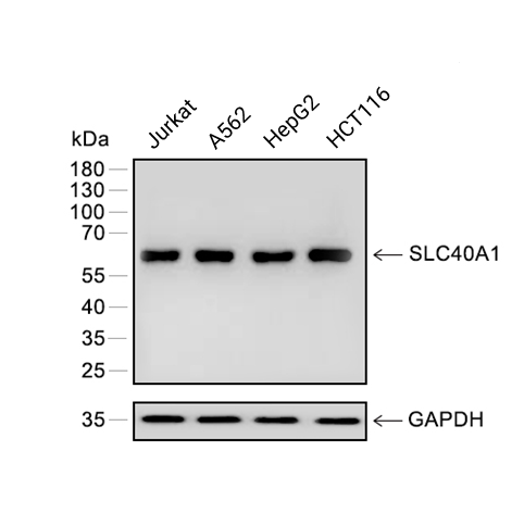 • Western blot analysis of extracts from Jurkat (lane 1) and K562 (lane 2) and HepG2 (lane 3) and HCT116 (lane 4) using SLC40A1 antibody. Proteins were transferred to a PVDF membrane and blocked with 5% nonfat powdered milk in PBST for 2 hour at room temperature. The primary antibody (1/1000) and loading control antibody (GAPDH, 1/3000) was diluted with 5% nonfat powdered milk in PBST at 4°C overnight. Goat Anti-Rabbit IgG-HRP Secondary Antibody (1/8,000) was incubated for 45min at room temperature.