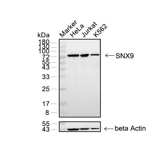 • Western blot analysis of extracts from HeLa (lane 2(20μg)),Jurkat (lane 3(20μg)) and K562(lane 4(20μg)) using SNX9 Rabbit mAb. Proteins were transferred to a PVDF membrane and blocked with 5% non-fat milk in TBST for 2 hour at room temperature. The primary antibody (1/1000) and Loading control antibody (beta Actin, HY-P83730, 1/5000) was used in 5% non-fat milk in TBST at 4°C overnight. Goat Anti-Rabbit/Mouse IgG-HRP Secondary Antibody (1/10000) was used for 1 hour at room temperature.