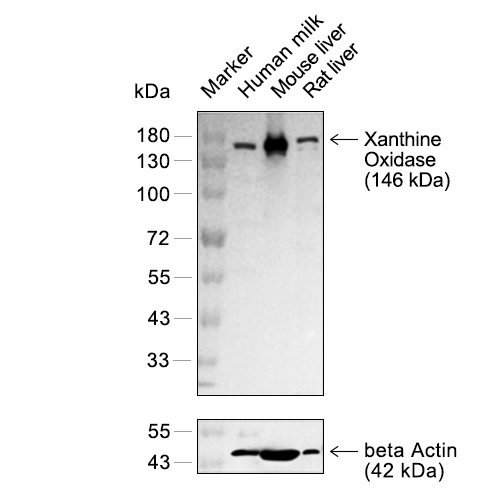 • Western blot analysis of extracts from Human milk (lane 2(20μg)) , Mouse liver (lane 3(20μg)) and Rat liver(lane 4(20μg)) using Xanthine Oxidase Rabbit mAb. Proteins were transferred to a PVDF membrane and blocked with 5% non-fat milk in TBST for 2 hour at room temperature. The primary antibody (1/1000) and Loading control antibody (beta Actin, HY-P83730, 1/5000) was used in 5% non-fat milk in TBST at 4°C overnight. Goat Anti-Rabbit/Mouse IgG-HRP Secondary Antibody (1/10000) was used for 1 hour at room temperature.