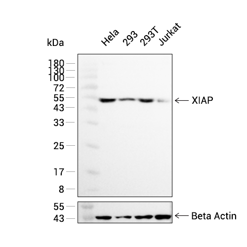 • Western blot analysis of extracts from HeLa (lane 2(20μg)) , 293 (lane 3(20μg)), 293T (lane 4(20μg)) and Jurkat(lane 4(20μg)) using XIAP Rabbit mAb. Proteins were transferred to a PVDF membrane and blocked with 5% non-fat milk in TBST for 2 hour at room temperature. The primary antibody (1/1000) and Loading control antibody (beta Actin, HY-P83730, 1/5000) was used in 5% non-fat milk in TBST at 4°C overnight. Goat Anti-Rabbit/Mouse IgG-HRP Secondary Antibody (1/10000) was used for 1 hour at room temperature.