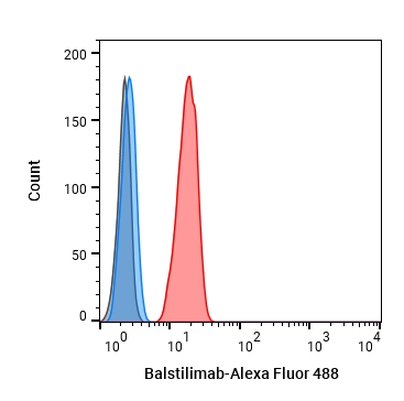 • Flow cytometric analysis of 1X106 10 ng/mL PMA and 1 μg/mL Ionomycin co-stimulated Jurkat cells(24h) with Balstilimab (HY-P99457, red). Cells were fixed with 4% paraformaldehyde. Then stained with the primary antibody at 1/200 dilution for an hour at 4℃. Alexa Fluor 488-conjugated AffiniPure Goat Anti-Human IgG H&L (HY-P83776) was used as the secondary antibody at 1/1,000 dilution for 30 minutes at 4℃. Human IgG4 kappa (HY-P99003, blue) was used as the isotype control, cells without incubation with primary antibody were used as the unlabeled control (black).