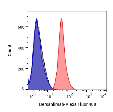 • Flow Cytometry analysis of Raji cells labelling ICAM1/CD54 (red) with Bersanlimab (anti-ICAM1/CD54) (HY-P99473). Goat Anti-Human IgG (Alexa Fluor 488) (HY-P83776) at a dilution of 1/1000 was used as the secondary antibody. Blue-Human IgG1 lambda2 (HY-P990096). Black-Unlabelled control, cells without incubation with primary antibody.
