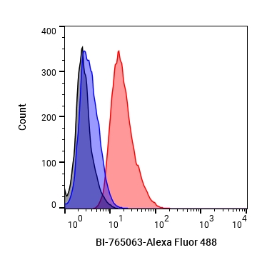 • Flow Cytometry analysis of U937 cells labelling SIRPa/CD172a (red) with BI-765063 (anti-SIRPa/CD172a) (HY-P990555). Goat Anti-Human IgG (Alexa Fluor 488) (HY-P83776) at a dilution of 1/1000 was used as the secondary antibody. Blue-Human IgG4 kappa (HY-P99003). Black-Unlabelled control, cells without incubation with primary antibody.