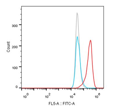 • Flow cytometry analysis of human CCR8 overexpression CHOK1 cells labelling human CCR8 with HY-P990908 at 100nM (Red). Goat anti human IgG Fc(Alexa Fluor 488) was used as the secondary antibody at 1/400 dilution. Isotype control - human IgG1k (Blue). Unlabeled control - Unlabelled cells (Gray).