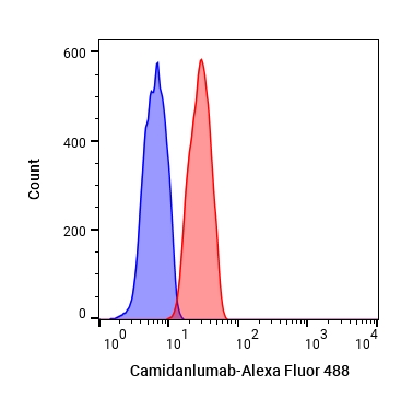 • Flow Cytometry analysis of Romas cells labelling IL-2Ra/CD25 (red) with Camidanlumab (anti-IL-2Ra/CD25) (HY-P99233). Goat Anti-Human IgG (Alexa Fluor 488) (HY-P83776) at a dilution of 1/1000 was used as the secondary antibody. Blue-Human IgG1 kappa (HY-P99001).