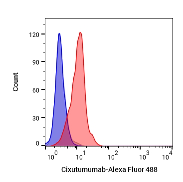 • Flow cytometric analysis of 1X106 MCF-7 cells with Cixutumumab (HY-P99189, red). Cells were fixed with 4% paraformaldehyde. Then stained with the primary antibody at 1/200 dilution for an hour at 4℃. Alexa Fluor 488-conjugated AffiniPure Goat Anti-Human IgG H&L (AF488) (HY-P83776) was used as the secondary antibody at 1/1,000 dilution for 30 minutes at 4℃. Human IgG1 lambda1 (HY-P99992, blue) was used as the isotype control, cells without incubation with primary antibody were used as the unlabeled control (black).