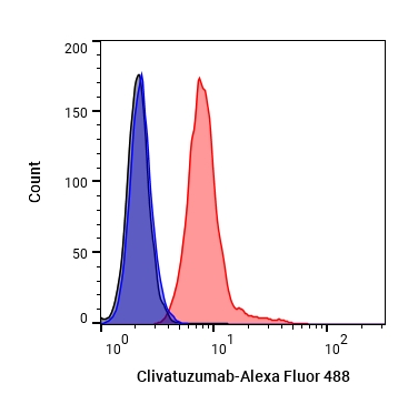 • Flow Cytometry analysis of Hela cells labelling MUC1 (red) with Clivatuzumab (anti-MUC1) (HY-P99968). Goat Anti-Human IgG (Alexa Fluor 488) (HY-P83776) at a dilution of 1/1000 was used as the secondary antibody. Blue-Human IgG1 kappa (HY-P99001). Black-Unlabelled control, cells without incubation with primary antibody.