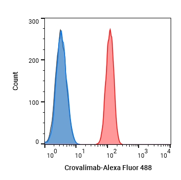 • Flow cytometric analysis of 1X106 HepG2 cells with Crovalimab (HY-P99965, red). Cells were fixed with 4% paraformaldehyde and permeabilised with 90% methanol. Then stained with the primary antibody at 1/50 dilution for an hour at 4℃. Alexa Fluor 488-conjugated AffiniPure Goat Anti-Human IgG H&L (HY-P83776) was used as the secondary antibody at 1/1,000 dilution for 30 minutes at 4℃. Human IgG1 kappa Isotype Control (HY-P99001, blue) was used as the isotype control, cells without incubation with primary antibody were used as the unlabeled control (black).