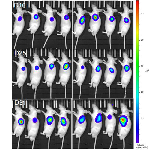 At Day 10, 25, and 31, mice are anesthetized with isoflurane and then injected with 75 mg/kg D-Luciferin solution for imaging.