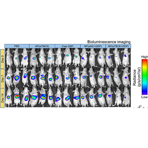 After cell inoculation for 7 days, mice are injected intraperitoneally with D-luciferin substrate at 150 mg/kg and anesthetized 10% chloral hydrate (5 mL/kg).