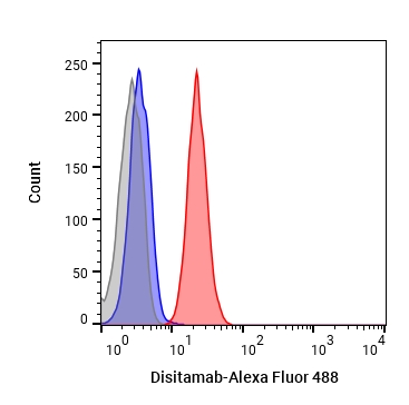 • Flow cytometric analysis of 1X106 MCF-7 cells with Disitamab (HY-P99854, red). Cells were fixed with 4% paraformaldehyde. Then stained with the primary antibody at 1/200 dilution for an hour at 4℃. Alexa Fluor 488-conjugated AffiniPure Goat Anti-Human IgG H&L (AF488) (HY-P83776) was used as the secondary antibody at 1/1,000 dilution for 30 minutes at 4℃. Human IgG1 kappa (HY-P99001, blue) was used as the isotype control, cells without incubation with primary antibody were used as the unlabeled control (black).