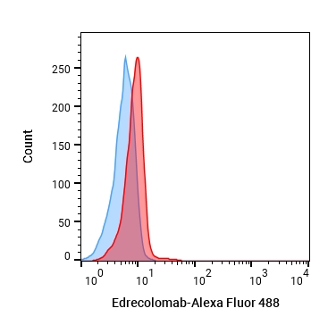 • Flow cytometric analysis of 1.5×106 HT-29 cells with Edrecolomab (HY-P99231, red). Cells were fixed with 4% paraformaldehyde. Then stained with the primary antibody at 1/200 dilution for an hour at 4℃. Alexa Goat Anti-Human IgG H&L (AF488) (HY-P83776) was used as the secondary antibody at 1/1,000 dilution for 30 minutes at 4℃. Mouse IgG2a kappa Isotype Control (HY-P99978, blue) was used as the isotype control.