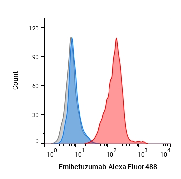 • Flow cytometric analysis of 1.5×106 MDA-MB-231 cells with Emibetuzumab (HY-P99192, red). Cells were fixed with 4% paraformaldehyde. Then stained with the primary antibody at 1/200 dilution for an hour at 4℃. Alexa Goat Anti-Human IgG H&L (AF488) (HY-P83776) was used as the secondary antibody at 1/1,000 dilution for 30 minutes at 4℃. Human IgG4 kappa Isotype Control (HY-P99003, blue) was used as the isotype control, cells without incubation with primary antibody were used as the unlabeled control (black).