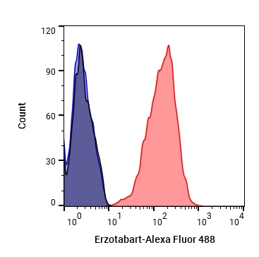 • Flow Cytometry analysis of Raji cells labelling CD38 (red) with Erzotabart (anti-CD38) (HY-P990037). Goat Anti-Human IgG (Alexa Fluor 488) (HY-P83776) at a dilution of 1/1000 was used as the secondary antibody. Blue-Human IgG1 kappa (HY-P99001). Black-Unlabelled control, cells without incubation with primary antibody.
