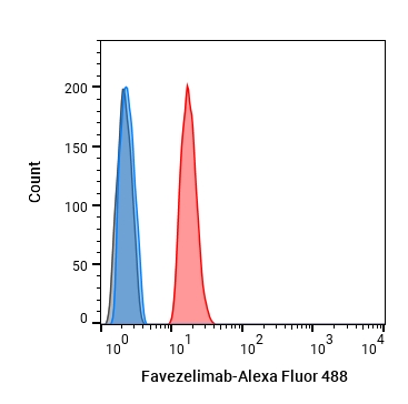 • Flow cytometric analysis of 1X106 Jurkat cells with Favezelimab (HY-P99613, red). Cells were fixed with 4% paraformaldehyde. Then stained with the primary antibody at 1/200 dilution for an hour at 4℃. Alexa Fluor 488-conjugated AffiniPure Goat Anti-Human IgG H&L (HY-P83776) was used as the secondary antibody at 1/1,000 dilution for 30 minutes at 4℃. Human IgG4 kappa (HY-P99003, blue) was used as the isotype control, cells without incubation with primary antibody were used as the unlabeled control (black).