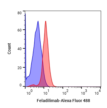 • Flow Cytometry analysis of Jurkat cells labelling ICOS/CD278 (red) with Feladilimab (anti-ICOS/CD278) (HY-P99363). Goat Anti-Human IgG (Alexa Fluor 488) (HY-P83776) at a dilution of 1/1000 was used as the secondary antibody. Blue-Human IgG4 kappa (HY-P99003). Black-Unlabelled control, cells without incubation with primary antibody.