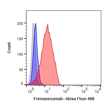 • Flow cytometric analysis of 1X106 A549 cells with Fremanezumab (HY-P99019, red). Cells were fixed with 4% paraformaldehyde. Then stained with the primary antibody at 1/200 dilution for an hour at 4℃. Alexa Fluor 488-conjugated AffiniPure Goat Anti-Human IgG H&L (AF488) (HY-P83776) was used as the secondary antibody at 1/1,000 dilution for 30 minutes at 4℃. Human IgG2 kappa (HY-P99002, blue) was used as the isotype control, cells without incubation with primary antibody were used as the unlabeled control (black).