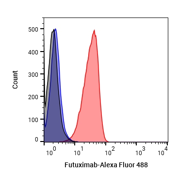 • Flow Cytometry analysis of A431 cells labelling EGFR (red) with Futuximab (anti-EGFR) (HY-P99628). Goat Anti-Human IgG (Alexa Fluor 488) (HY-P83776) at a dilution of 1/1000 was used as the secondary antibody. Blue-Human IgG1 kappa (HY-P99001). Black-Unlabelled control, cells without incubation with primary antibody.
