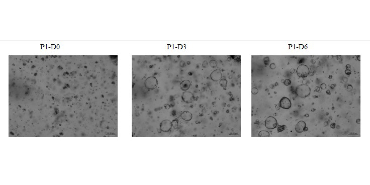 Human colonic cells isolated from fresh colon tissues can be used for human colonic organoid culture with the HY-K6112 medium. The human colonic organoids reach 100 μm in diameter within 6 days after passage. The cultured human colonic organoids can be passaged within 7-10 days (scale bar: 100 μm).