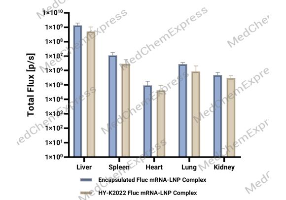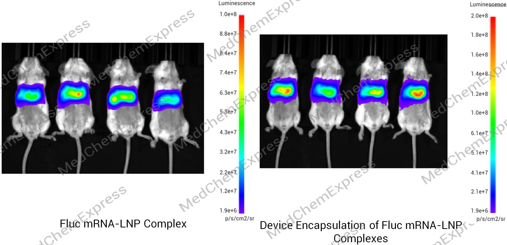 Balb/c mice​​ were intravenously injected with ​​Fluc mRNA-LNP complexes​​ at a single dose of ​​0.5 mpk (10 μg per mouse)​​. ​​​​In vivo imaging​​ performed ​​6 hours post-administration​​ revealed that the ​​In vivo OptiLNP RNA Transfection Reagent (Systemic Effect) (HY-K2022)​​ demonstrated ​​efficient transfection​​ (targeting the ​​liver/spleen​​) with ​​comparable efficacy to conventional encapsulation methods​​.
