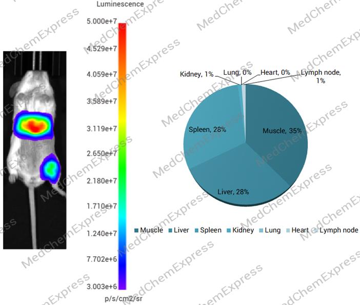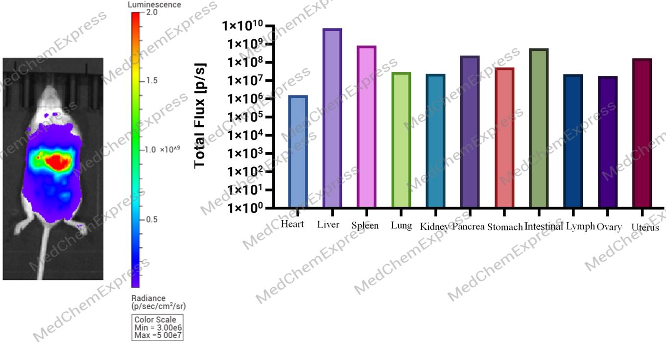Balb/c mice​​ were intraperitoneally injected with ​​Fluc mRNA-LNP complexes​​ at a single dose of ​​0.5 mpk (10 μg per mouse)​​. ​​In vivo imaging​​ performed ​​6 hours post-administration​​ revealed that the ​​In vivo OptiLNP RNA Transfection Reagent (Systemic Effect) (HY-K2022)​​ achieved ​​high-efficiency delivery​​ to the ​​injection site, liver, spleen​​, and other tissues.