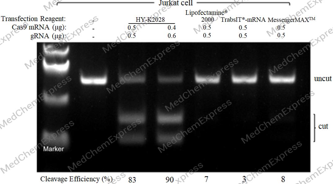 Co-transfect 0.5 µg of Cas9 mRNA (expressing Cas9 protein) and 0.5 µg of gRNA into Jurkat cells. 48 hours after transfection, the cleavage efficiency was verified using T7E1. The results showed that the OptiLNP Gene Editing Kit (Immune Cells) (HY-K2028) exhibited favorable cleavage efficiency.