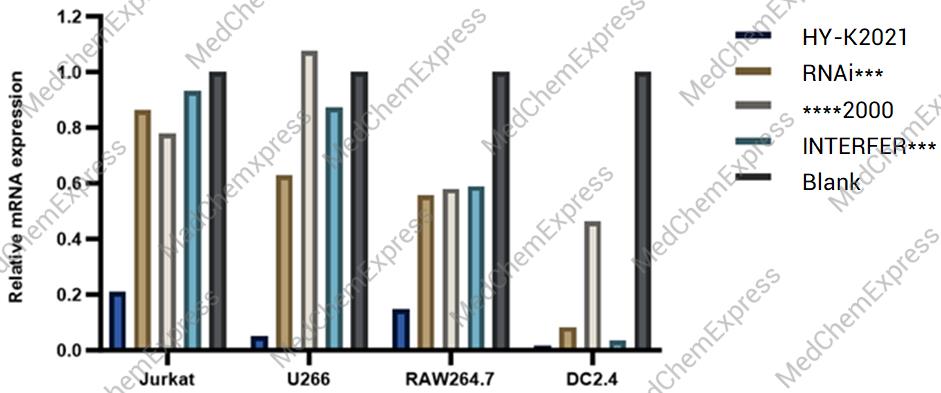 Compared to other transfection reagents, OptiLNP RNA Transfection Reagent (Immune Cells) (HY-K2021) demonstrates effective gene silencing in Jurkat, U266, RAW264.7, and DC2.4 cells.