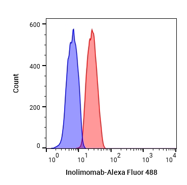• Flow Cytometry analysis of Romas cells labelling IL-2Ra/CD25 (red) with Inolimomab (anti-IL-2Ra/CD25) (HY-P99664). Goat Anti-Human IgG (Alexa Fluor 488) (HY-P83776) at a dilution of 1/1000 was used as the secondary antibody. Blue-Mouse IgG1 kappa (HY-P99977).