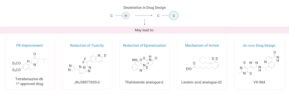 氘代药物是把药物分子上特定位点的氢原子用氘原子替代所获得的药物,理论上通过氘氢交换,可以改善药物的药代动力学或毒性。2017 年 4 月,美国食品药品监督管理局(FDA)批准了全球首个氘代药物 Auspex 公司的氘代丁苯那嗪片(Deuterabenazine)上市,用于罕见的常染色体显性遗传病亨廷顿舞蹈病。2022 年,FDA 批准了另一款全新氘代药物 Deucravacitinib,该药物被广泛应用于治疗多种自身免疫性疾病,包括经典型干燥症候群、类风湿性关节炎和牛皮癣等[1][2]