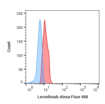• Flow cytometric analysis of 1.5×106 THP-1 cells with Leronlimab (HY-P99697, red). Cells were fixed with 4% paraformaldehyde and permeabilised with 90% methanol. Then stained with the primary antibody at 1/200 dilution for an hour at 4℃. Alexa Goat Anti-Human IgG H&L (AF488) (HY-P83776) was used as the secondary antibody at 1/1,000 dilution for 30 minutes at 4℃. Human IgG4 (S228P) kappa Isotype Control (HY-P99003, blue) was used as the isotype control, cells without incubation with primary antibody were used as the unlabeled control (black).