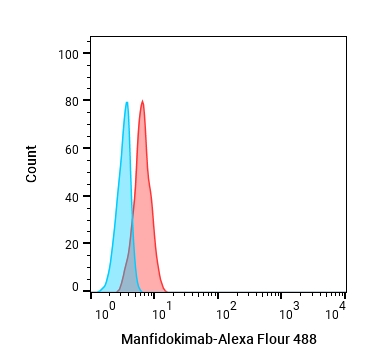 • Flow cytometric analysis of 1.5×106 Ramos cells with Manfidokimab (HY-P99724, red). Cells were fixed with 4% paraformaldehyde. Then stained with the primary antibody at 1/200 dilution for an hour at 4℃. Goat Anti-Human IgG H&L (AF488) (HY-P83776) was used as the secondary antibody at 1/1,000 dilution for 30 minutes at 4℃. Human IgG4 kappa (HY-P99003, blue) was used as the isotype control.