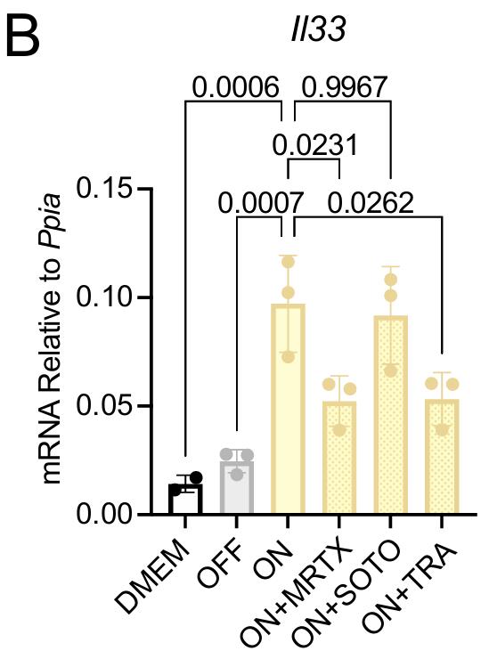 MRTX1133 (0.5 μM; 24 h)-treated 9805 cells produce conditioned medium (CM) that induces a reduction in Il33 expression in CD1WT fibroblasts.