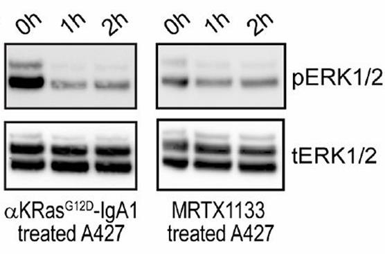 Western blot showing phosphorylated and total ERK1/2 in lysates of KRASG12D-mutated A427 cells, treated with anti-KRASG12D-IgA1 or MRTX1133.