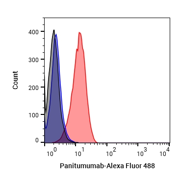 • Flow Cytometry analysis of A431 cells labelling EGFR (red) with Panitumumab (anti-EGFR) (HY-P99041A). Goat Anti-Human IgG (Alexa Fluor 488) (HY-P83776) at a dilution of 1/1000 was used as the secondary antibody. Blue-Human IgG2 kappa (HY-P99002). Black-Unlabelled control, cells without incubation with primary antibody.