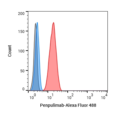 • Flow cytometric analysis of 1X106 10 ng/mL PMA and 1 μg/mL Ionomycin co-stimulated Jurkat cells(24h) with Penpulimab (HY-P99108, red). Cells were fixed with 4% paraformaldehyde. Then stained with the primary antibody at 1/200 dilution for an hour at 4℃. Alexa Fluor 488-conjugated AffiniPure Goat Anti-Human IgG H&L (HY-P83776) was used as the secondary antibody at 1/1,000 dilution for 30 minutes at 4℃. Human IgG1 kappa (HY-P99001, blue) was used as the isotype control, cells without incubation with primary antibody were used as the unlabeled control (black).