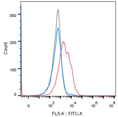• Flow cytometry analysis of VEGFR2 overexpression HEK293 cells labelling VEGFR2 with Ramucirumab at 200 nM (Red). Goat anti human IgG Fc (Alexa Fluor488) was used as the secondary antibody at 1/1000 dilution. Isotype control - human IgG (Blue). Unlabeled control - Unlabelled cells (Gray).