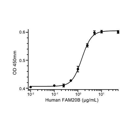 The FAM20B protein plays a key role in regulating mature glycosaminoglycan (GAG) chains by catalyzing xylose 2-O-phosphorylation in the glycosaminoglycan-protein linking region of the proteoglycan. This process is critical for the synthesis of sulfated GAGs (such as heparan sulfate and chondroitin sulfate) on the common GAG-protein linking region (GlcUAbeta1-3Galbeta1-3Galbeta1-4Xylbeta1-O-Ser) of the core protein. FAM20B Protein, Human (HEK293, Fc) is the recombinant human-derived FAM20B protein, expressed by HEK293 , with N-hFc labeled tag.