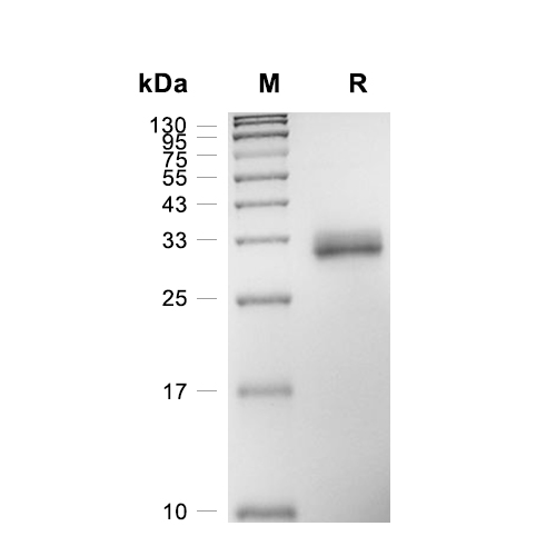 FOLR2 蛋白与叶酸结合,能够在中性 pH 条件下以高亲和力将 5-甲基四氢叶酸转运到细胞中。内吞作用后,暴露于弱酸性 pH 值会引起构象变化,显着降低 FOLR2 的叶酸亲和力并将其从受体上释放。FOLR2 蛋白, Human (HEK293, His) 是重组的 FOLR2 蛋白,由 HEK293 表达,带有 C-His 标签。